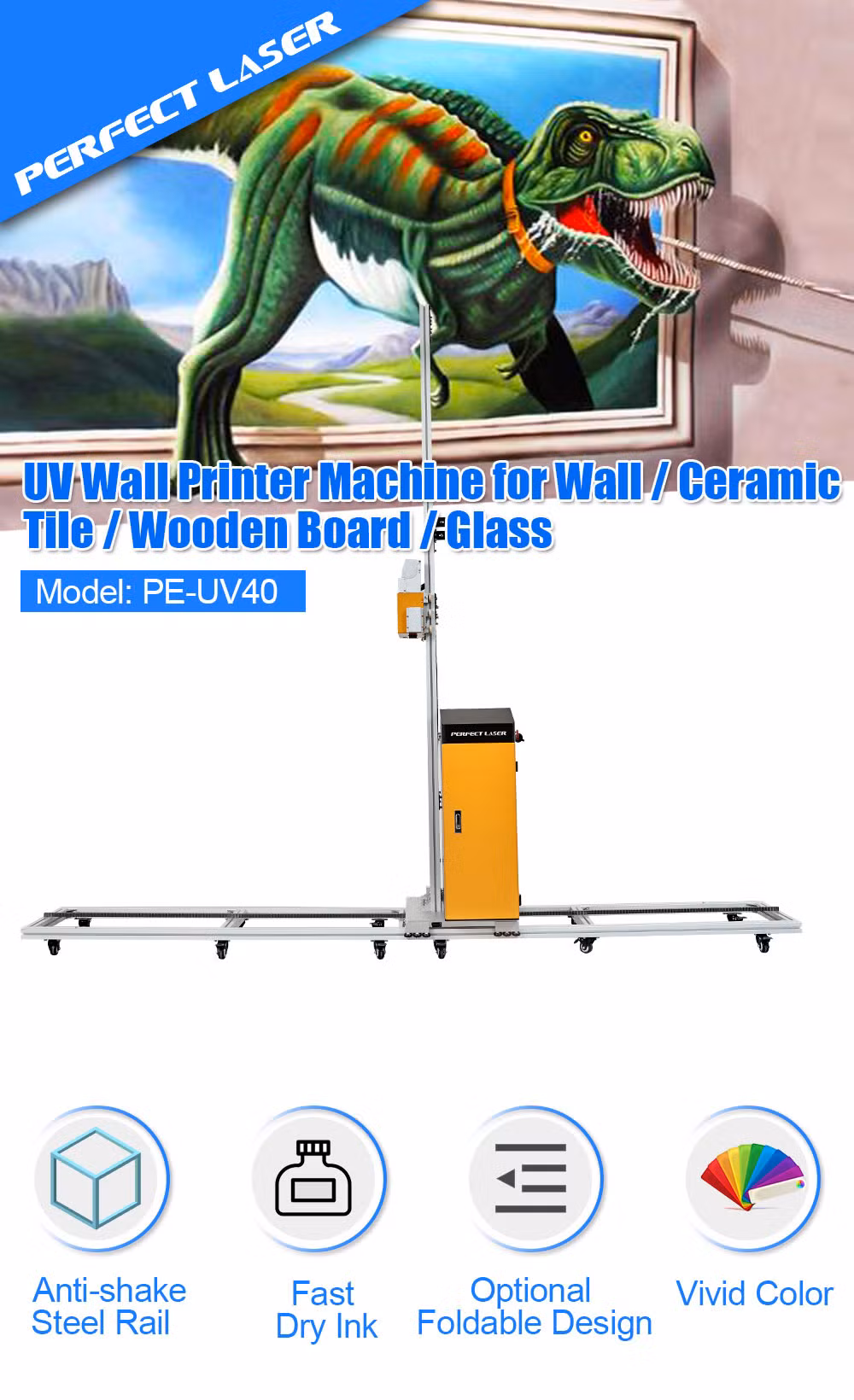 Настенный УФ-принтер PE-UV40 отличается изысканным и модным дизайном, использует популярную на рынке H-раму, сифонную систему непрерывной подачи чернил, двухсенсор автоматической индукции, микропьезоэлектрическую струйную технологию и различные капли чернил, что делает печать более яркой и реалистичной.